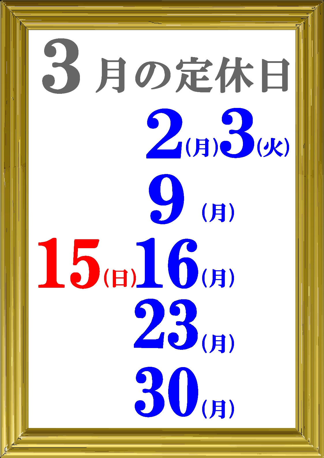 3月の定休日とスッタフ公休日のお知らせ