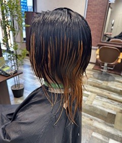 カットが終わり緑色が効果的に作用するように側頭骨より下をブリーチする事にする